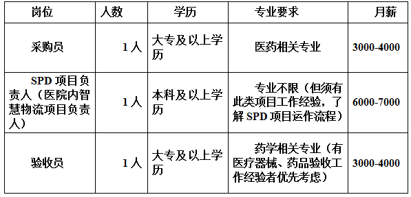 SPD項目負(fù)責(zé)人:1.物流及相關(guān)專業(yè)專科及以上學(xué)歷;2..醫(yī)藥或醫(yī)療器械物流管理工作經(jīng)驗;3.熟悉醫(yī)院器械產(chǎn)品或藥品作業(yè)流程。4.具有一定的SPD項目管理能力和經(jīng)驗,能做好項目整體規(guī)劃和管理。