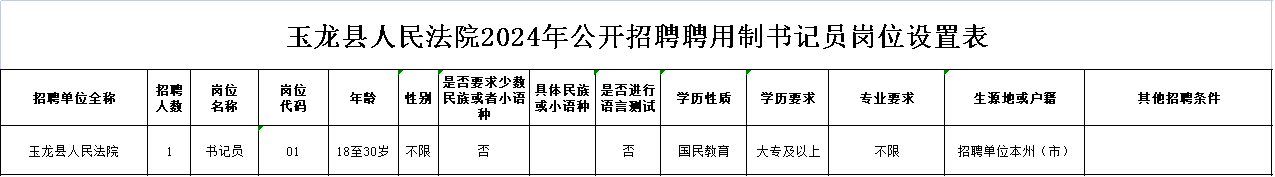 招聘計劃詳見《玉龍縣人民法院2024年公開招聘聘用制書記員計劃表》(以下簡稱《計劃表》)。