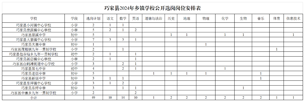 此次公開選崗崗位49個(gè),各學(xué)段各學(xué)科崗位計(jì)劃如下: