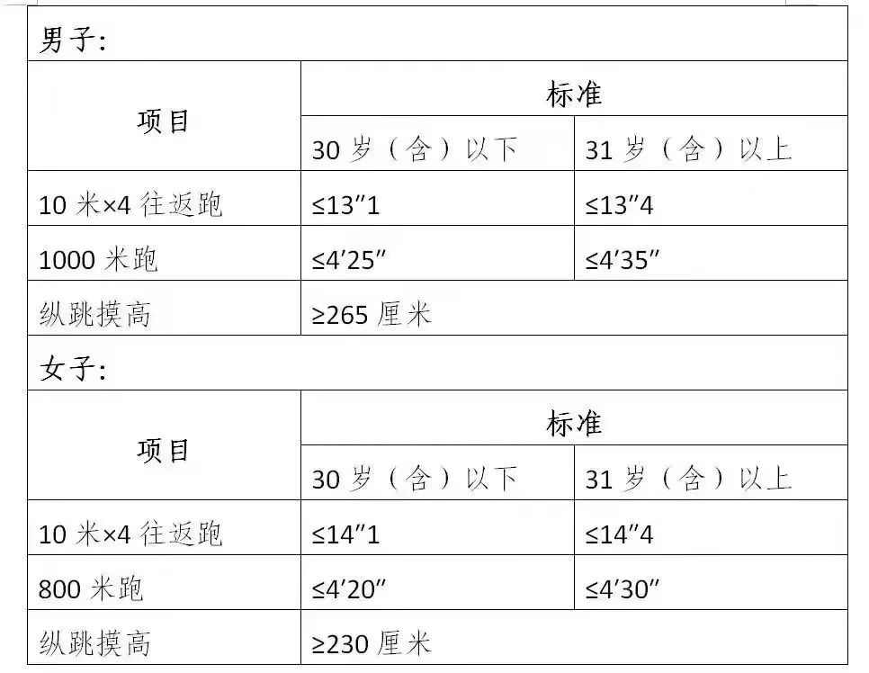 資格審核合格的人員進(jìn)入體能測(cè)試,體能測(cè)試按照公安部《關(guān)于印發(fā)公安機(jī)關(guān)錄用人民警察體能測(cè)評(píng)項(xiàng)目和標(biāo)準(zhǔn)(暫行)的通知》及其所附標(biāo)準(zhǔn)開(kāi)展。體能測(cè)試的項(xiàng)目如下: