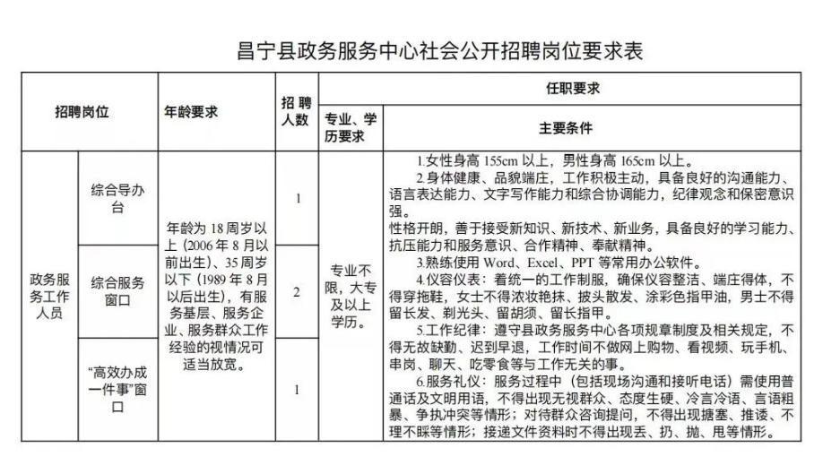 詳見附件2《昌寧縣政務(wù)服務(wù)中心社會公開招聘崗位要求表》中崗位具體要求。