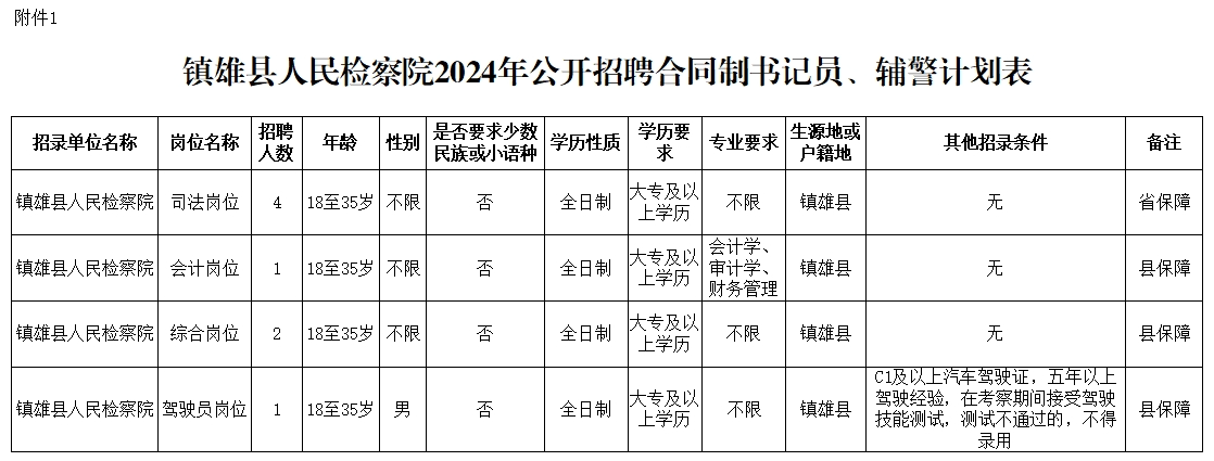 附件1 :《鎮(zhèn)雄縣人民檢察院2024年公開招聘合同制書記員、輔警計劃表》如下圖: