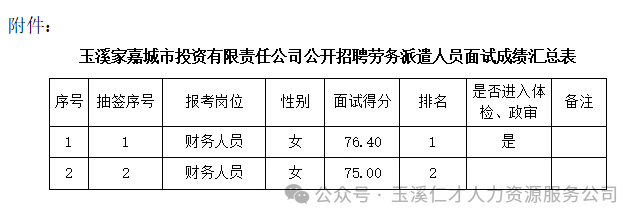 玉溪家嘉城市投資有限責任公司公開招聘勞務派遣工作人員面試成績公示