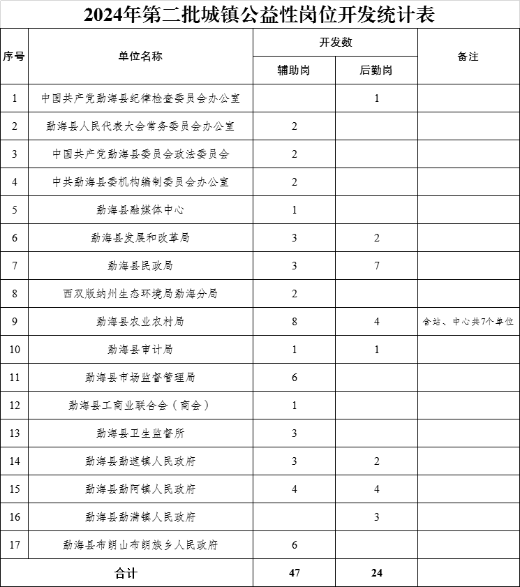 招聘崗位71個。具體招聘崗位數(shù)量詳見《勐海縣2024年第二批城鎮(zhèn)公益性崗位開發(fā)統(tǒng)計表》。