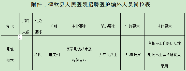 德欽縣人民醫(yī)院是德欽縣唯一一所二級(jí)甲等綜合醫(yī)院,根據(jù)醫(yī)院業(yè)務(wù)發(fā)展需求,決定面向社會(huì)公開招聘編外醫(yī)學(xué)影像技術(shù)人員(具體詳見附件),現(xiàn)將有關(guān)事項(xiàng)公告如下: