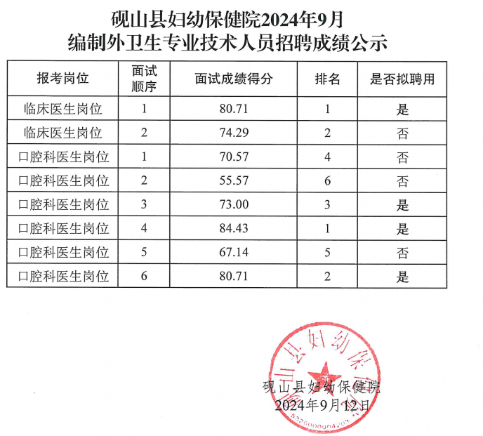 硯山縣婦幼保健院 2024年9月編制外衛(wèi)生專(zhuān)業(yè)技術(shù)人員招聘成績(jī)公示: