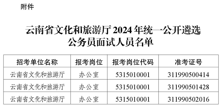 附件:云南省文化和旅游廳2024年統(tǒng)一公開(kāi)遴選公務(wù)員面試人員名單