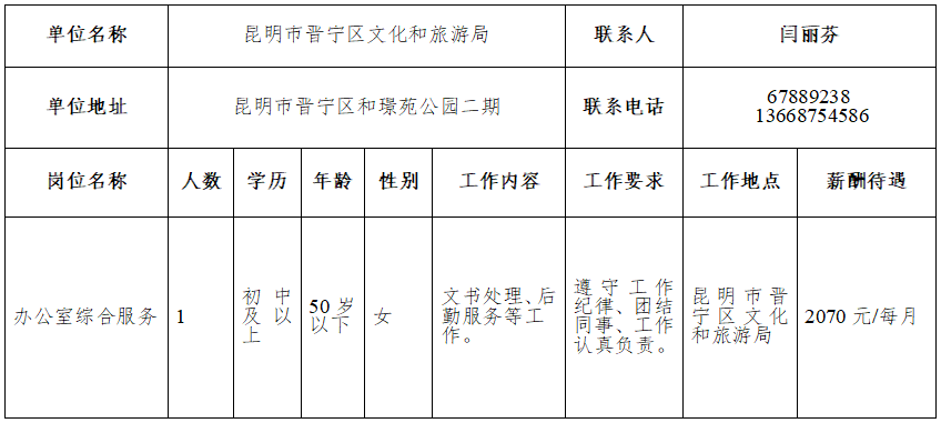 根據(jù)《昆明市人力資源和社會保障局昆明市財政局 關(guān)于做好公益性崗位開發(fā)管理有關(guān)工作的通知》(昆人社通〔2020〕37號)精神,按照公開、公平、公正的原則,晉寧區(qū)文化和旅游局擬招聘公益性崗位工作人員一名,現(xiàn)將相關(guān)情況公告如下: