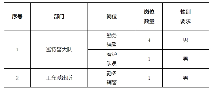 本次面向社會公開共招錄6名警務(wù)輔助人員(男性),其中勤務(wù)輔警5名,看護(hù)隊員1名。