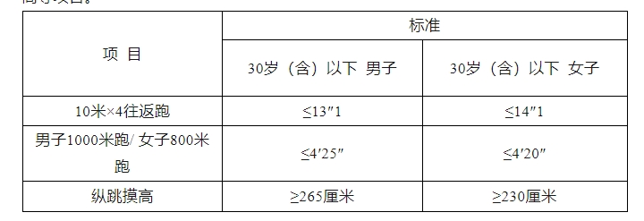 (一)體能測評體能測評時間和地點(diǎn):另行通知。評測標(biāo)準(zhǔn):參照《公安機(jī)關(guān)錄用人民警察體能測試項(xiàng)目和標(biāo)準(zhǔn)(暫行)》(人社部發(fā)【2011】48號)進(jìn)行評定,內(nèi)容含10米X4往返跑、1000米(女子800米)跑、縱跳摸高等項(xiàng)目。