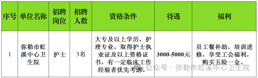現(xiàn)因?qū)嶋H業(yè)務(wù)發(fā)展工作需要,彌勒市虹溪中心衛(wèi)生院堅(jiān)持“公正公開(kāi)、德才兼?zhèn)洹⒕C合評(píng)定、擇優(yōu)聘任”的招聘原則,現(xiàn)面向社會(huì)公開(kāi)招聘編外護(hù)士3名。現(xiàn)將有關(guān)事宜公告如下:
