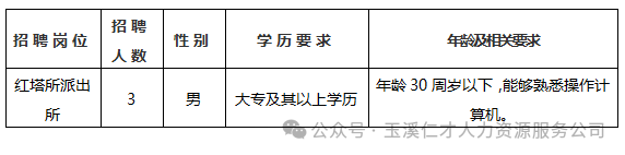 根據(jù)工作需要,經(jīng)研究決定,面向社會(huì)公開招聘玉溪市公安局紅塔分局警務(wù)輔助人員3名。現(xiàn)將有關(guān)事項(xiàng)公布如下: