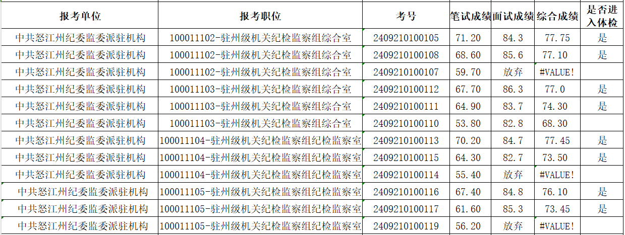 根據(jù)《2024年怒江州州級機關(guān)統(tǒng)一公開遴選公務(wù)員公告》和《2024年怒江州州級機關(guān)統(tǒng)一公開遴選公務(wù)員面試公告》,現(xiàn)將考生綜合成績和進入體檢情況公示如下(體檢相關(guān)事宜由各單位自行通知):