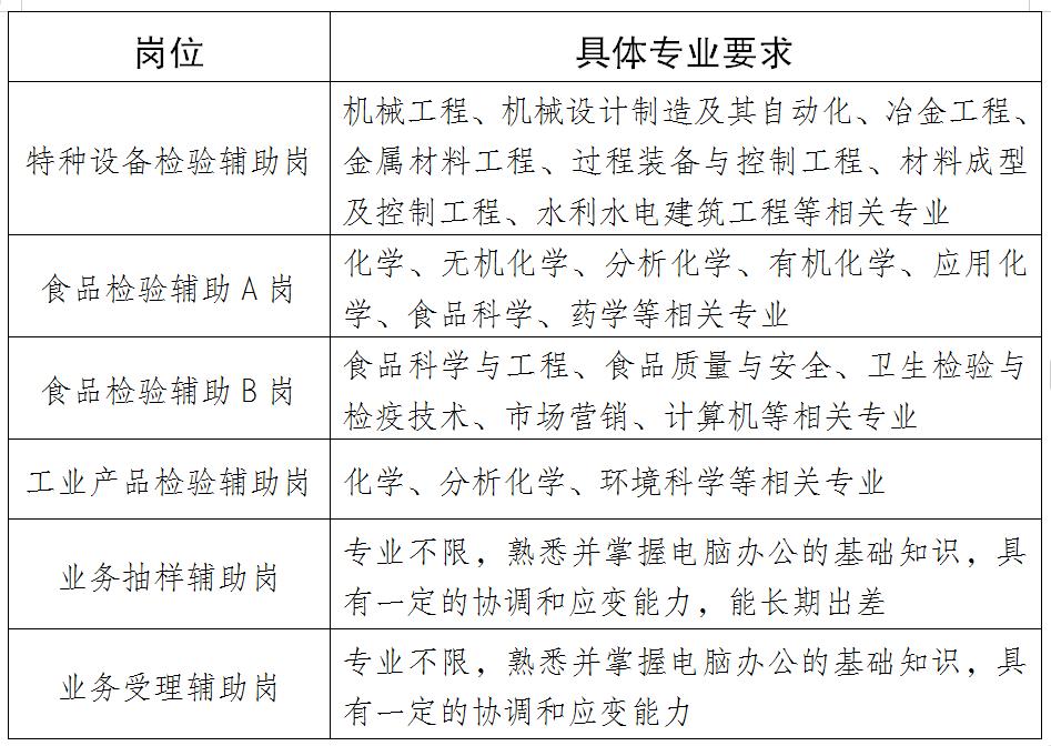 3.大學(xué)本科及以上文化程度,具有檢驗(yàn)檢測(cè)工作經(jīng)歷或抽樣工作經(jīng)歷的可放寬到大專學(xué)歷,且滿足以下具體崗位專業(yè)要求: