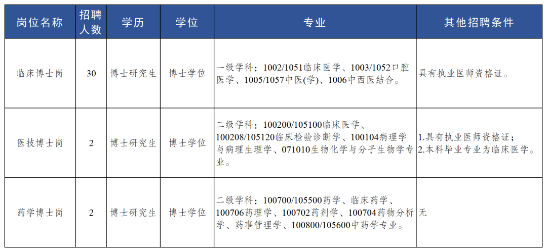 博士崗(34人):面向一級(jí)學(xué)科的臨床醫(yī)學(xué)、口腔醫(yī)學(xué)、中醫(yī)(學(xué))、中西醫(yī)結(jié)合相關(guān)專(zhuān)業(yè)招聘臨床醫(yī)師30人;面向二級(jí)學(xué)科的臨床醫(yī)學(xué)、臨床檢驗(yàn)診斷學(xué)、病理學(xué)與病理生理學(xué)、生物化學(xué)與分子生物學(xué)專(zhuān)業(yè)招聘臨床醫(yī)技2人,面向藥學(xué)相關(guān)專(zhuān)業(yè)招聘藥師2人。具體崗位要求如下: