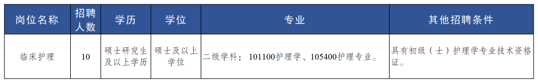 臨床護(hù)理(10人):面向護(hù)理(學(xué))專(zhuān)業(yè)的碩士及以上畢業(yè)生招聘護(hù)理人員10人。具體崗位要求如下: