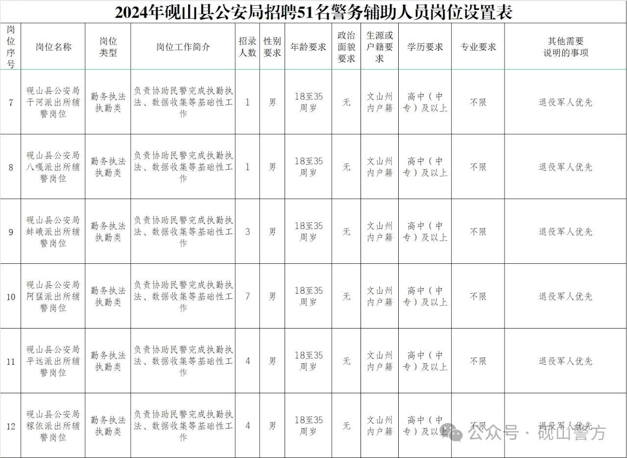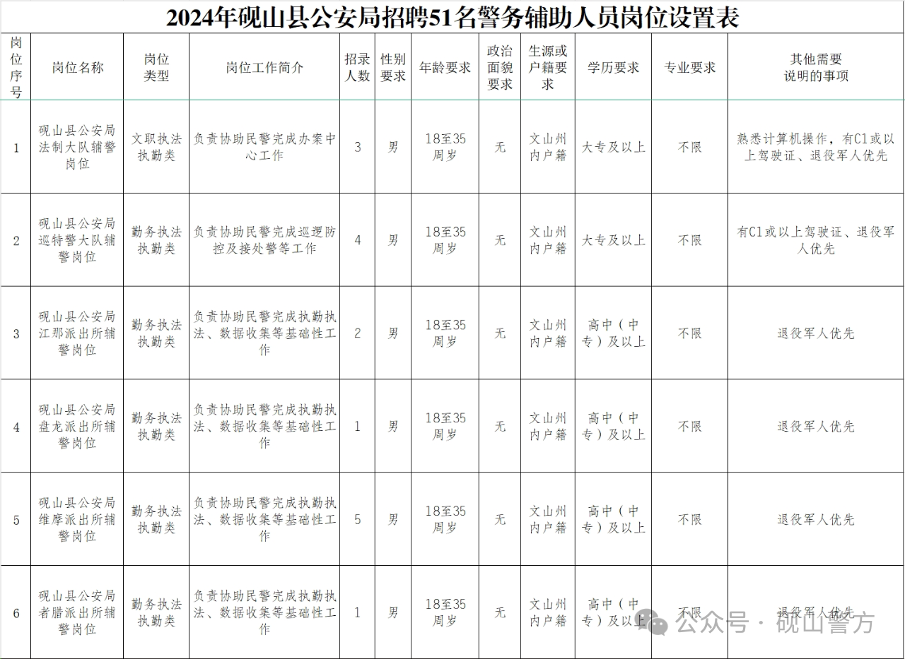 硯山縣公安局此次面向社會(huì)公開招聘輔警51名。招聘崗位及人數(shù)詳見《硯山縣公安局招聘警務(wù)輔助人員崗位設(shè)置表》。