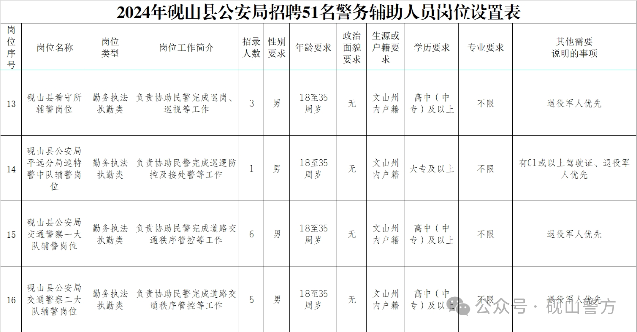2、在本縣有固定住所,男性年滿18至35周歲(1989年10月14日出生至2006年10月14日出生)的中華人民共和國公民,具有招聘崗位所要求的文化程度及其他要求(詳見《硯山縣公安局招聘警務(wù)輔助人員崗位設(shè)置表》),有特殊技能或符合招聘條件的急需人才年齡可適當(dāng)放寬。