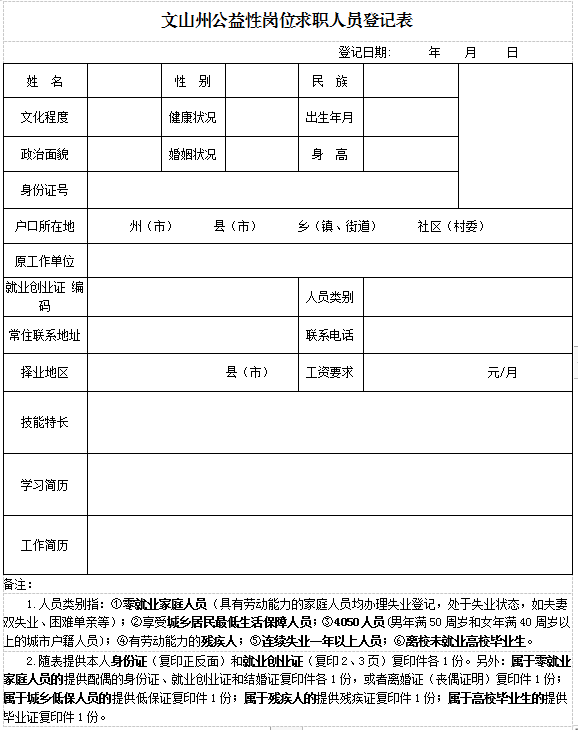 附件:《文山州公益性崗位求職人員登記表》