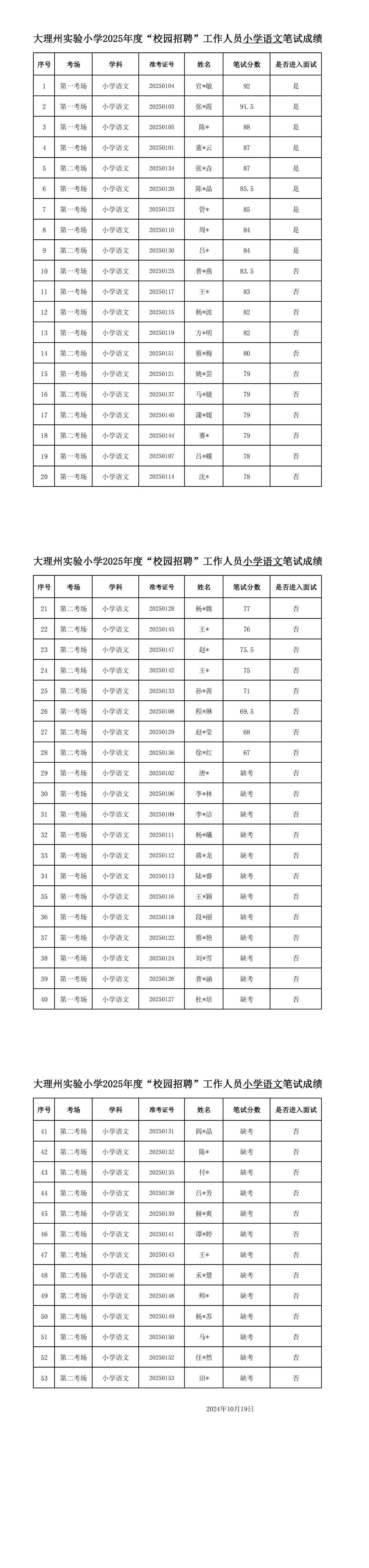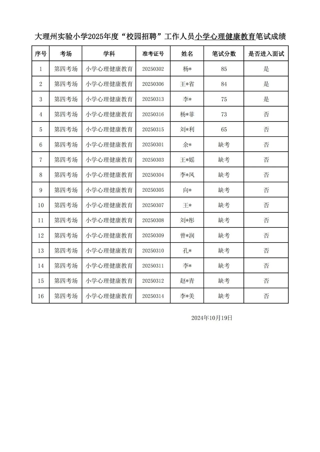 根據(jù)《大理州教育體育系統(tǒng)2025年度“校園招聘”工作人員公告》等有關(guān)規(guī)定,大理州實(shí)驗(yàn)小學(xué)于2024年10月19日上午組織2025年度“校園招聘”工作人員筆試考核,現(xiàn)將報(bào)考大理州實(shí)驗(yàn)小學(xué)考生筆試成績(jī)公布如下: