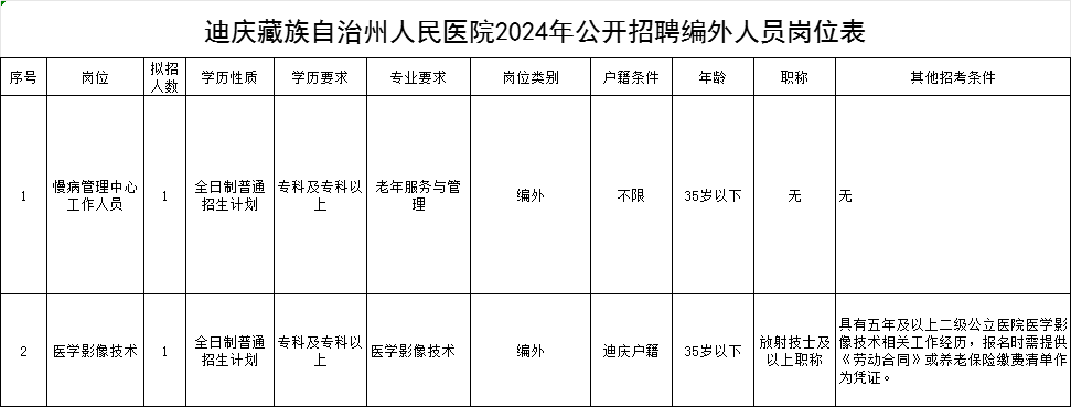 迪慶藏族自治州人民醫(yī)院2024年編外人員招聘公告
