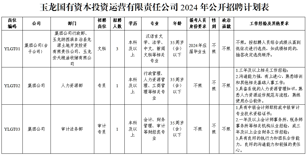 3.崗位所需的專業(yè)和其他條件(詳見附件《玉龍國有資本投資運營有限責(zé)任公司2024年公開招聘計劃表》);