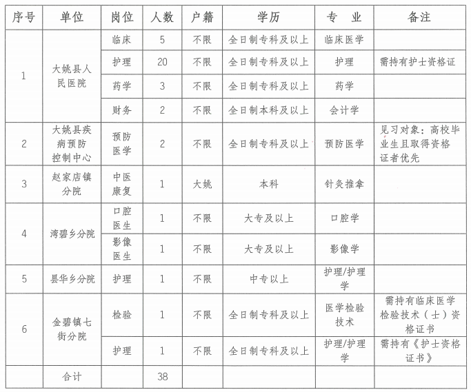 因根據(jù)工作需要,經(jīng)研究,大姚縣緊密型縣域醫(yī)共體總醫(yī)院縣鄉(xiāng)各分院擬招聘就業(yè)見習(xí)人員38名,現(xiàn)將有關(guān)事項(xiàng)公告如下: