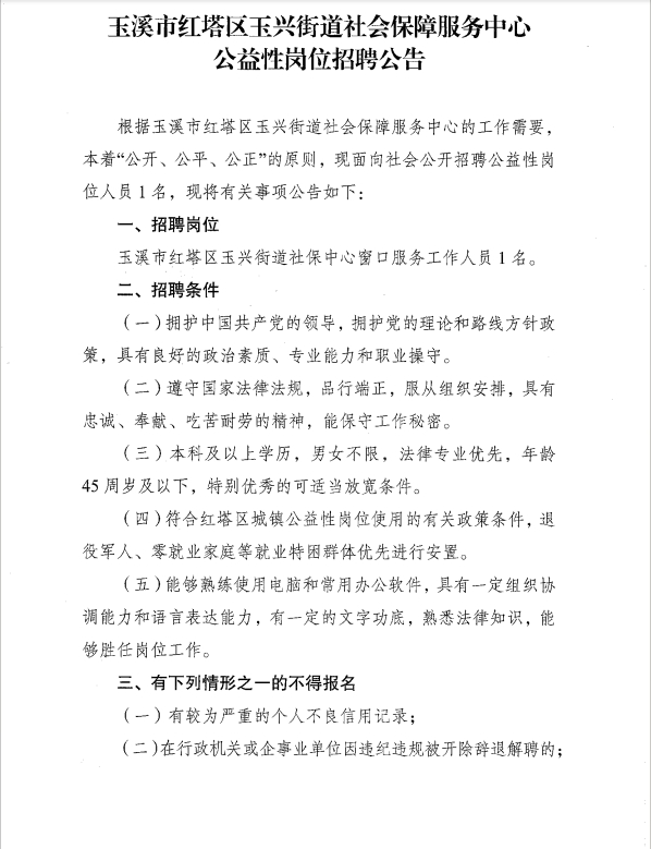 紅塔區(qū)玉興街道社保中心公益性崗位招聘公告