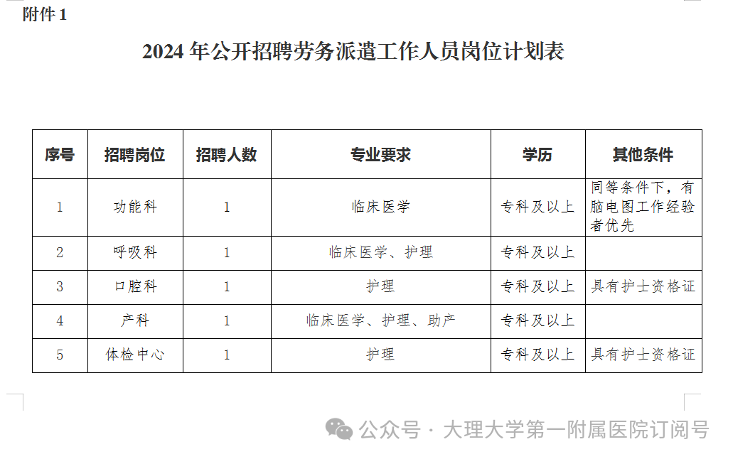 根據(jù)2024年用人計(jì)劃,大理大學(xué)第一附屬醫(yī)院面向社會(huì)公開(kāi)招聘勞務(wù)派遣工作人員5名,現(xiàn)將具體事宜公告如下: