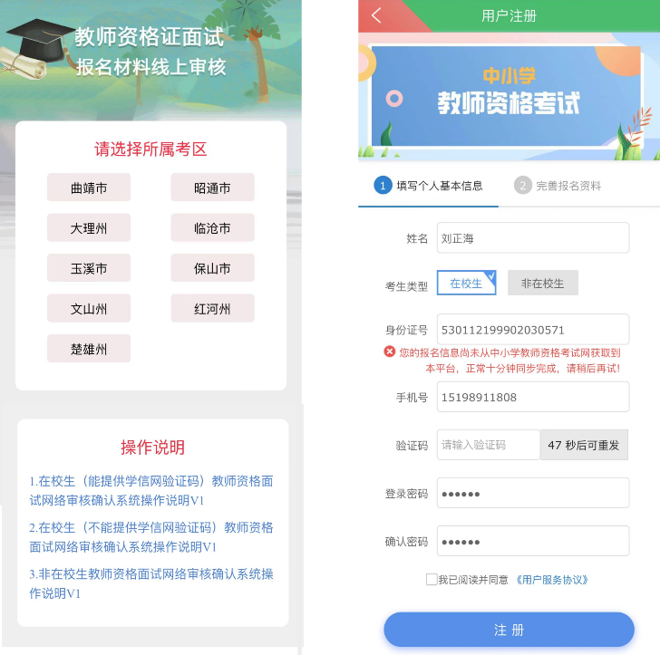 2、選擇在中小學(xué)教師資格考試網(wǎng)報(bào)考對(duì)應(yīng)的考區(qū),進(jìn)入登錄界面,沒(méi)有賬號(hào)的點(diǎn)擊注冊(cè),注冊(cè)需按照實(shí)際情況選擇在校生和非在校生。在中小學(xué)教師資格考試網(wǎng)報(bào)名成功后,正常10分鐘后可以在本系統(tǒng)注冊(cè),注冊(cè)成功后登錄審核系統(tǒng)。
