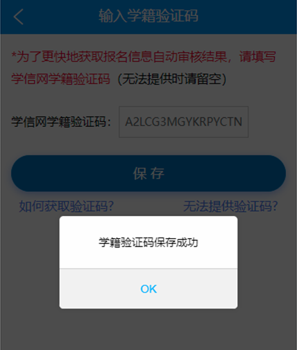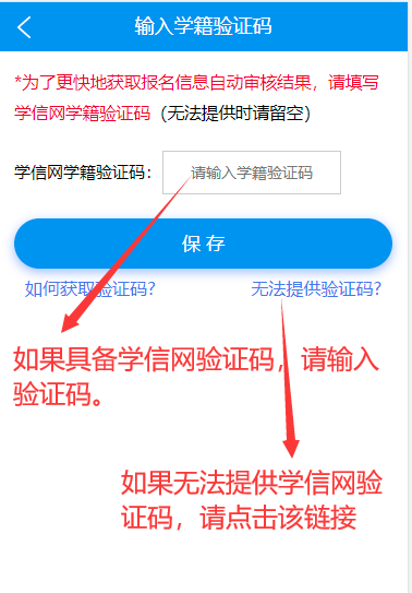 在校生(學(xué)信網(wǎng)驗(yàn)證碼):在校生能提供學(xué)信網(wǎng)驗(yàn)證碼直接輸入驗(yàn)證碼保存(請(qǐng)注意學(xué)信網(wǎng)學(xué)籍驗(yàn)證是否在有效期內(nèi)),如果在校生確實(shí)無(wú)法提供學(xué)信網(wǎng)驗(yàn)證碼,點(diǎn)擊下圖提供的“無(wú)法提供驗(yàn)證碼”文字鏈接,之后根據(jù)上傳材料界面提示上傳相應(yīng)材料即可。