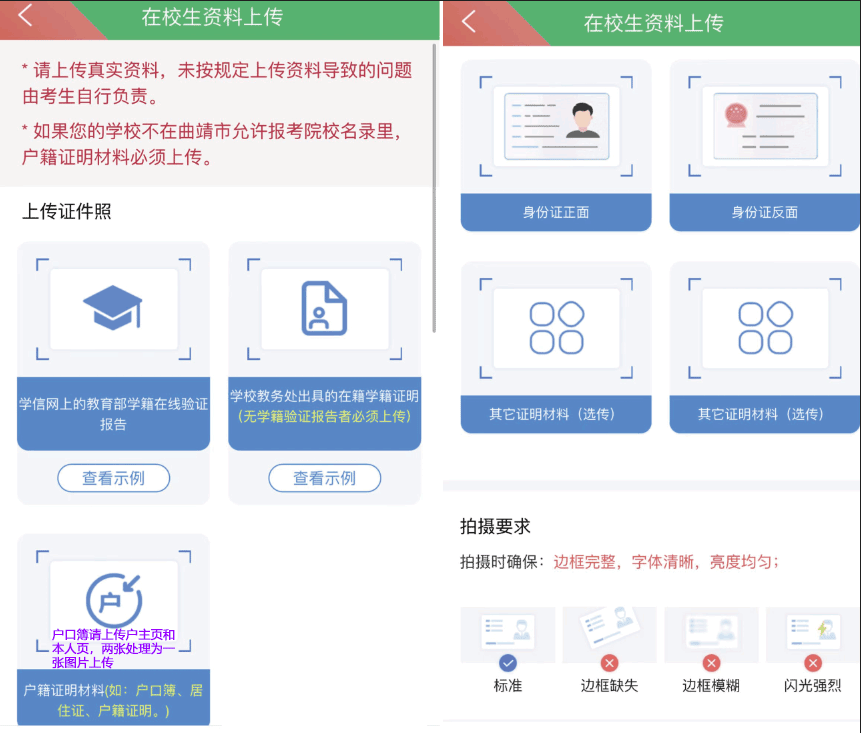 考生分為在校生能提供學(xué)信網(wǎng)驗(yàn)證碼、在校生不能提供學(xué)信網(wǎng)驗(yàn)證碼、非在校生。把相應(yīng)類別的考生上傳資料有區(qū)別,系統(tǒng)均有提示,按照提示上傳即可。
