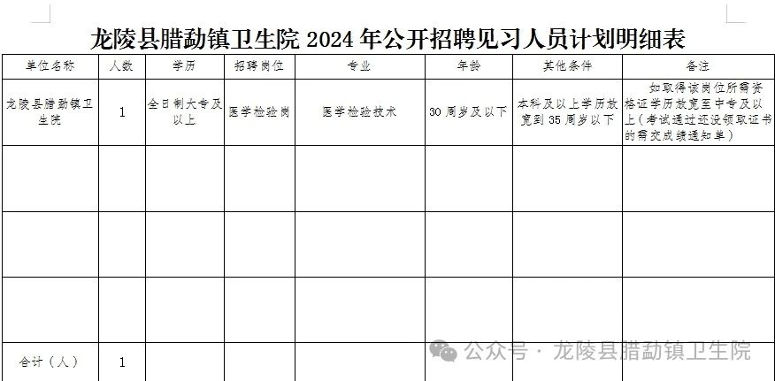 附件:龍陵縣臘勐鎮(zhèn)衛(wèi)生院2024年公開招聘見習(xí)人員計(jì)劃明細(xì)表