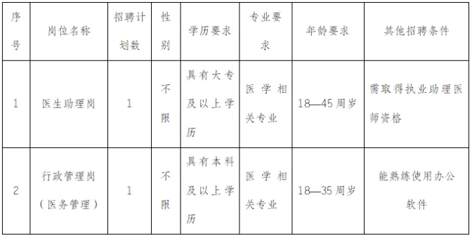 醫(yī)生助理崗1人、行政管理崗(醫(yī)務(wù)管理)1人。