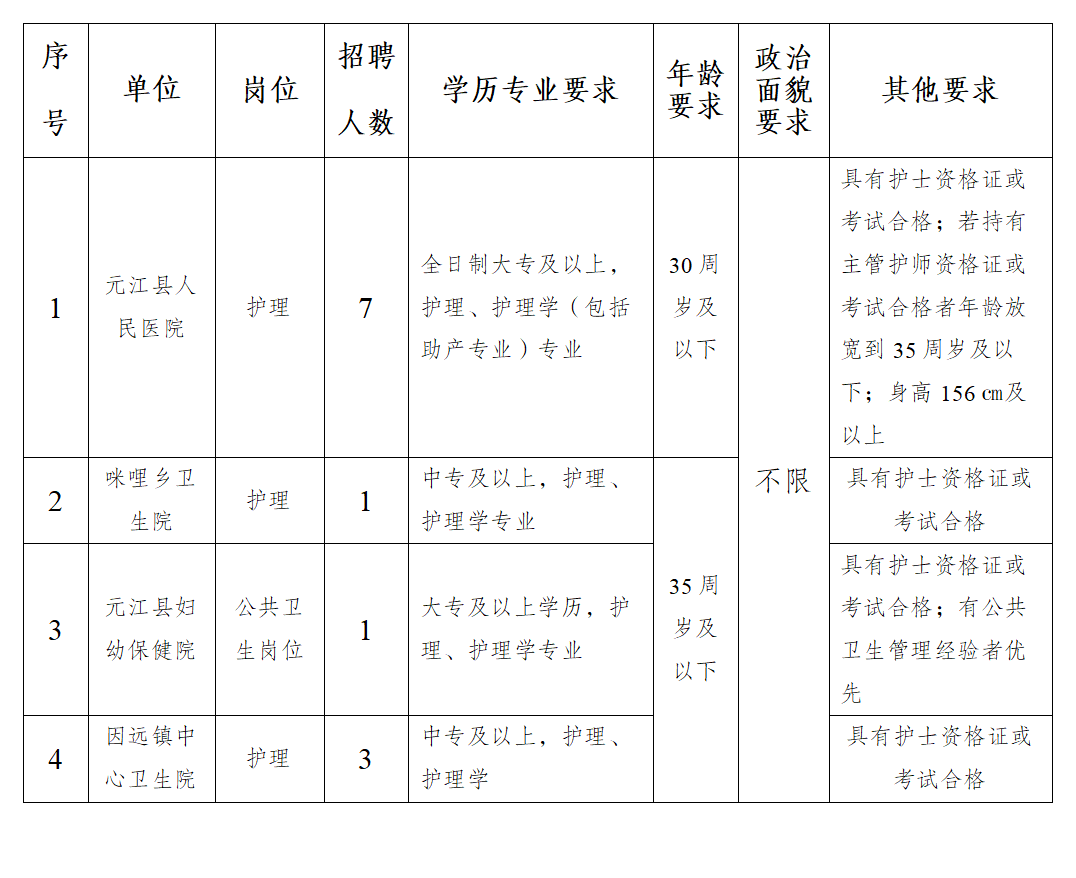 現(xiàn)因元江縣人民醫(yī)院護理崗位報名人數(shù)滿足不了工作需求,經(jīng)研究,決定對元江縣醫(yī)共體2024年公開招聘第二批編制外工作人員(護理崗位)作出調(diào)整,現(xiàn)將調(diào)整招聘事宜公告如下: