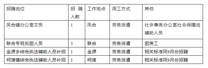 關(guān)于招聘鳳合鎮(zhèn)辦公室文員、聯(lián)合鄉(xiāng)專班后廚人員、金源鄉(xiāng)和柯渡鎮(zhèn)綜合執(zhí)法輔助人員補(bǔ)招的公告