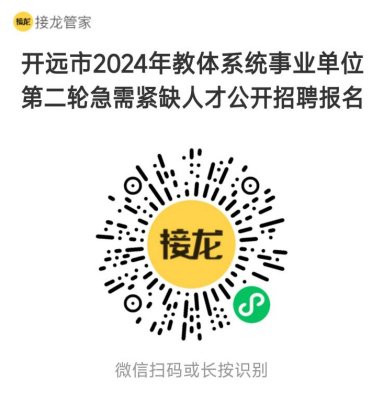 3.報(bào)名方式:本次實(shí)行網(wǎng)絡(luò)報(bào)名,應(yīng)聘人員掃描下方二維碼進(jìn)行報(bào)名,到報(bào)名截止時(shí)間未完成報(bào)名步驟和提供相應(yīng)材料的,視為放棄報(bào)名資格,報(bào)名過程中如遇問題可聯(lián)系開遠(yuǎn)市教育體育局人事科,聯(lián)系電話:0873-7122831。