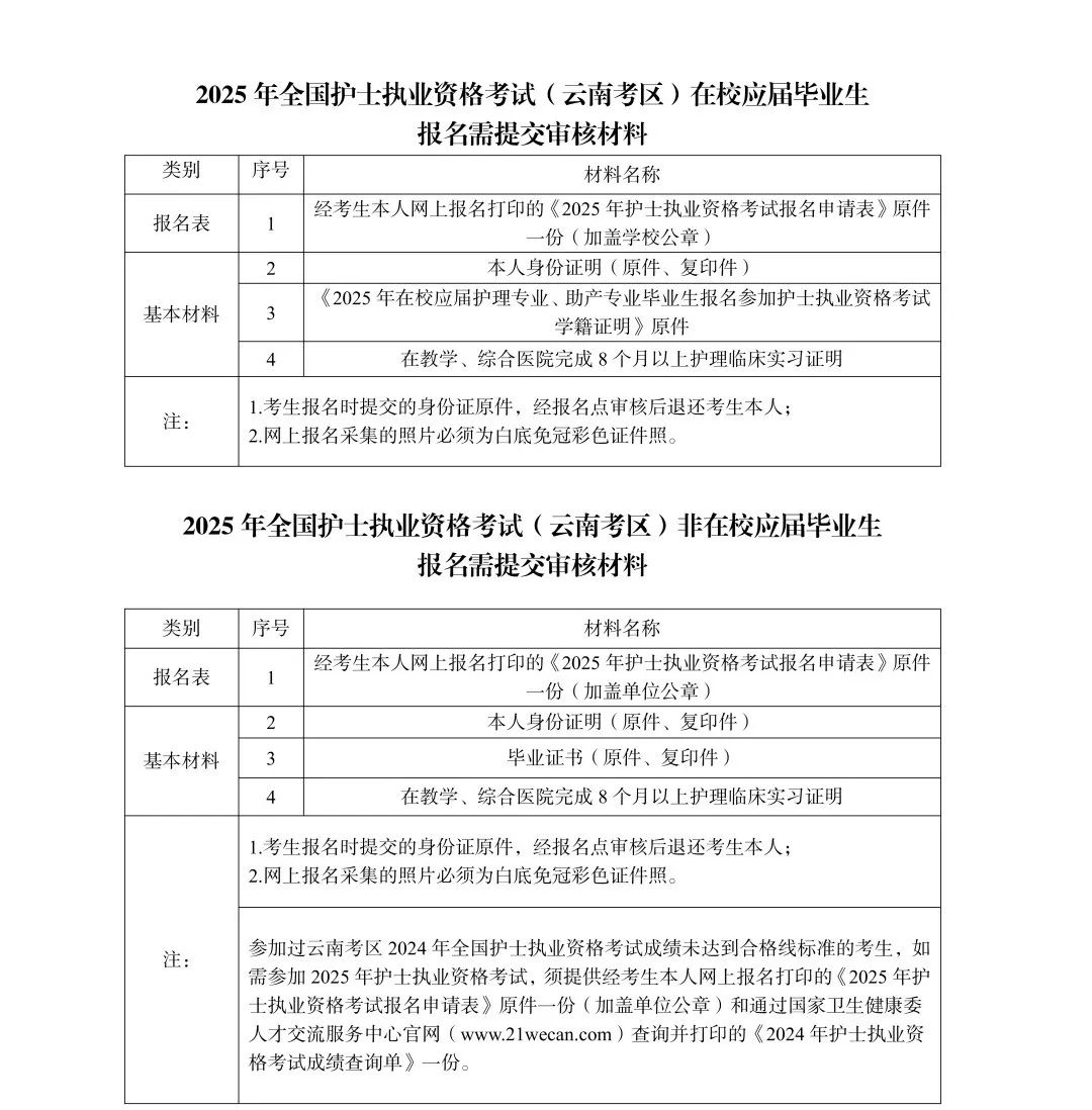 申請人為在校應(yīng)屆(2025 屆)畢業(yè)生的,應(yīng)當(dāng)持有所在學(xué)校出具的應(yīng)屆畢業(yè)生學(xué)籍證明;申請人為非應(yīng)屆畢業(yè)生的,可以選擇到人事檔案所在地報名。考生可登錄云南衛(wèi)生健康人才網(wǎng)( www.ynwsjkrc.cn)查詢2025 年全國護(hù)士執(zhí)業(yè)資格考試(云南考區(qū))報名需提交材料目錄。