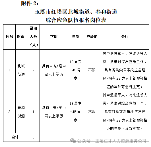 綜合應急隊伍人員3人(因主要從事綜合應急相關工作,該崗位適合男性),北城街道2名,春和街道1名。