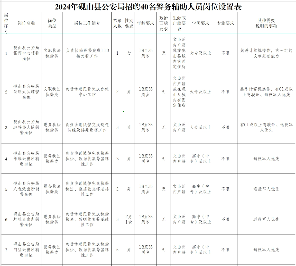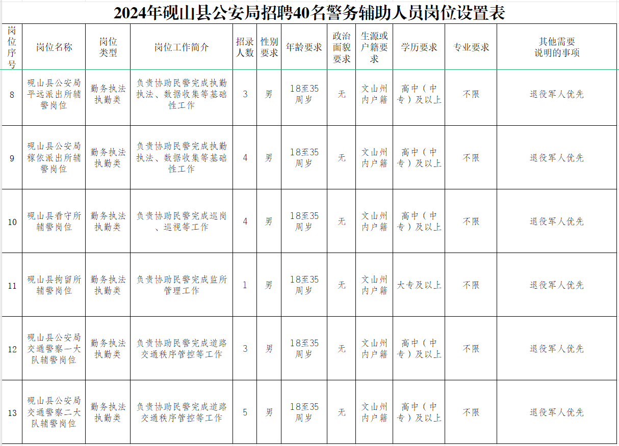 (1)關注微信公眾號“硯山警方”查看《2024年文山州公安局警務輔助人員招聘公告》及《崗位設置表》。