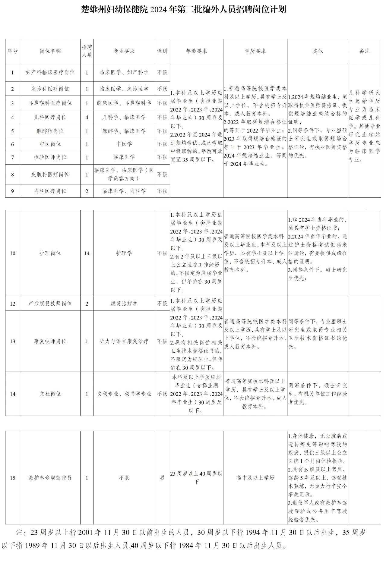 附件:1.楚雄州婦幼保健院2024年第二批編外人員招聘崗位計(jì)劃