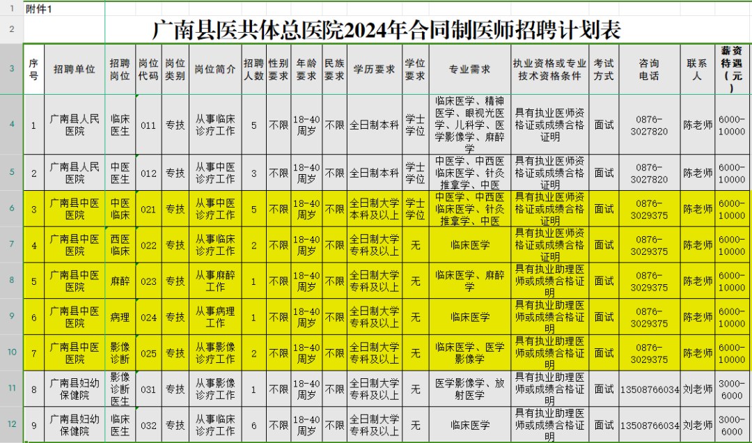 詳見《廣南縣醫(yī)共體總醫(yī)院2024年合同制醫(yī)師招聘計劃表》(附件1)。