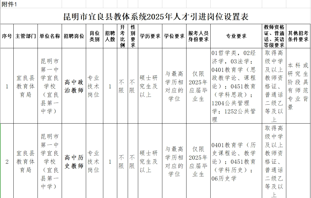 昆明市第一中學宜良學校2025年人才引進崗位設(shè)置表