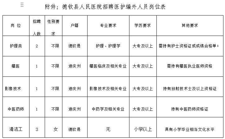 德欽縣人民醫(yī)院是德欽縣唯一一所二級甲等綜合醫(yī)院,根據(jù)醫(yī)院業(yè)務發(fā)展需求,決定面向社會公開招聘編外護理、醫(yī)學影像技術(shù)、中醫(yī)藥、藏醫(yī)臨床及清潔工等工作人員(具體詳見附件),現(xiàn)將有關(guān)事項公告如下:
