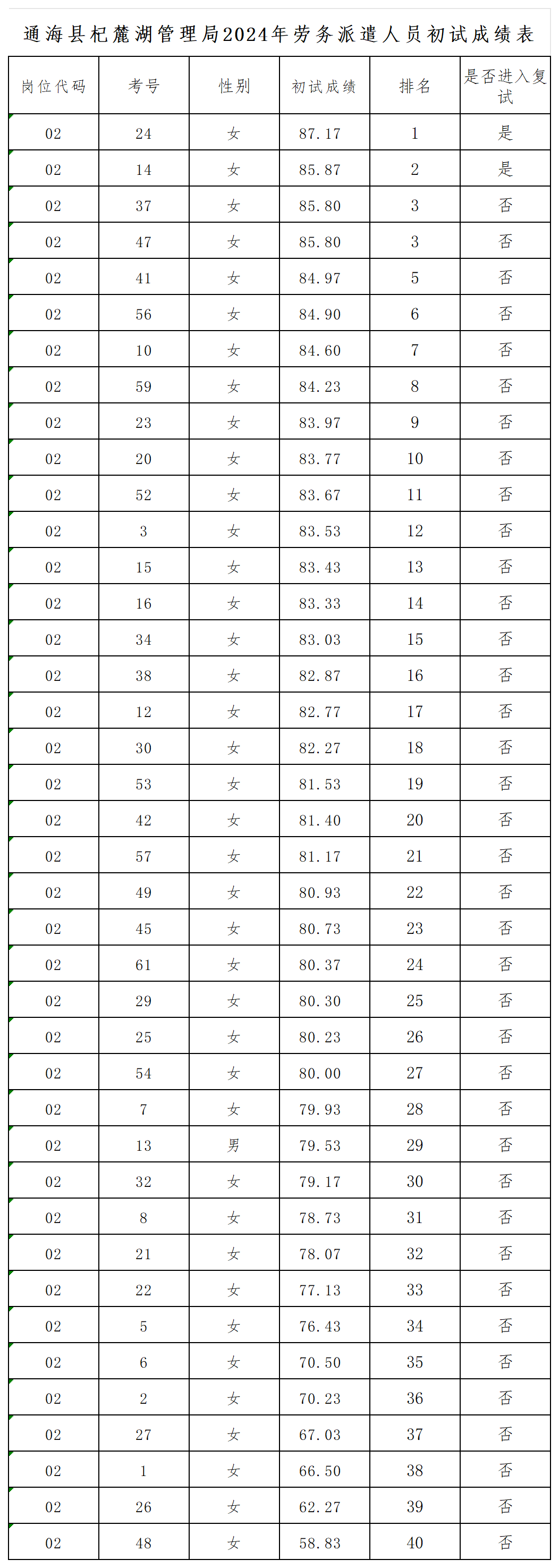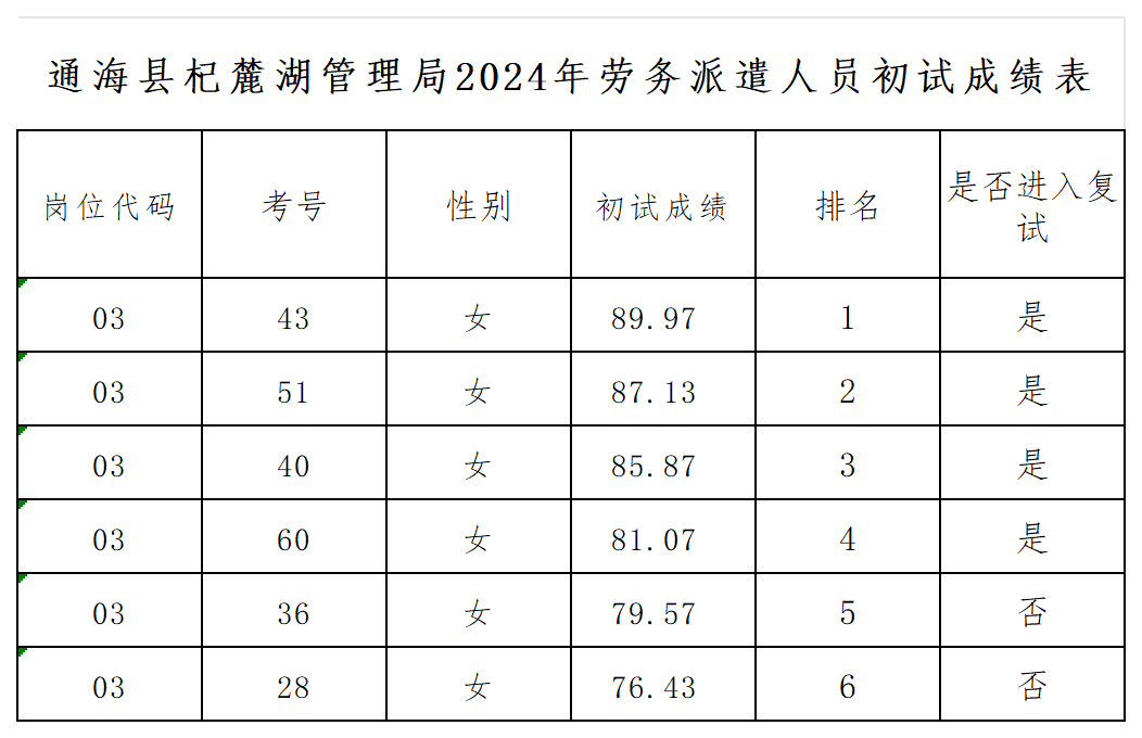 一、通海縣杞麓湖管理局2024年勞務(wù)派遣人員招聘初試成績(jī)及進(jìn)入復(fù)試人員名單