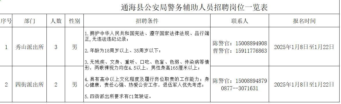 招聘|通海縣公安局公開招聘警務(wù)輔助人員5名 因工作需要,通海縣公安局面向社會(huì)公開招聘警務(wù)輔助人員5名。男性,主要從事外勤工作。 一、招聘崗位及要求: