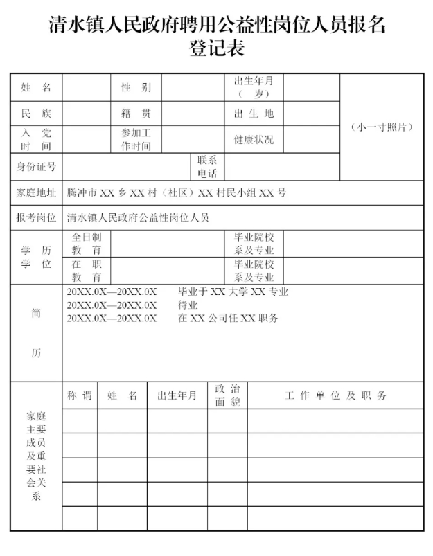 附件:清水鎮(zhèn)人民政府聘用公益性崗位人員報名登記表