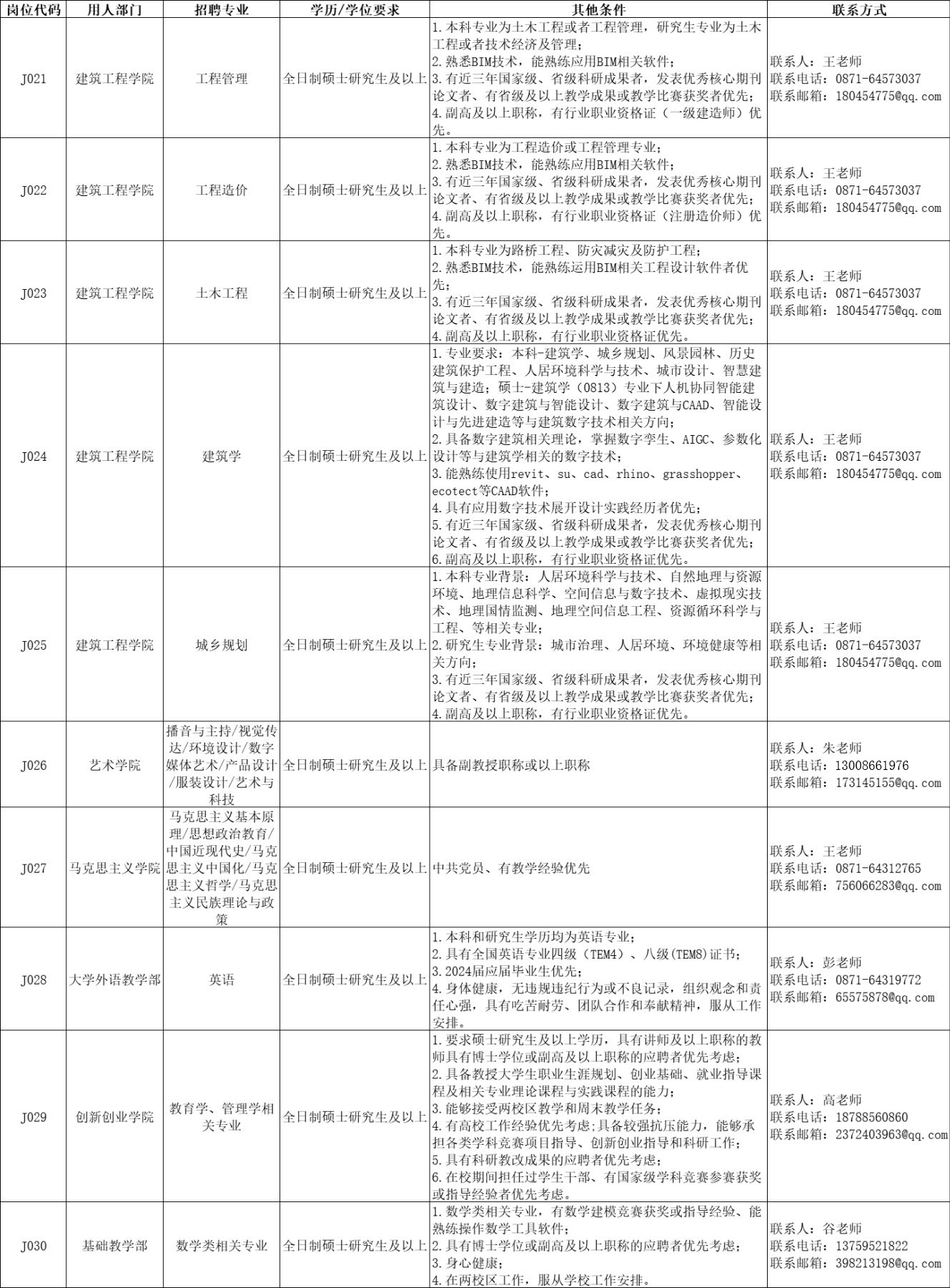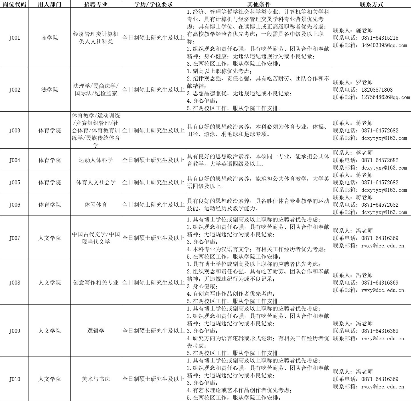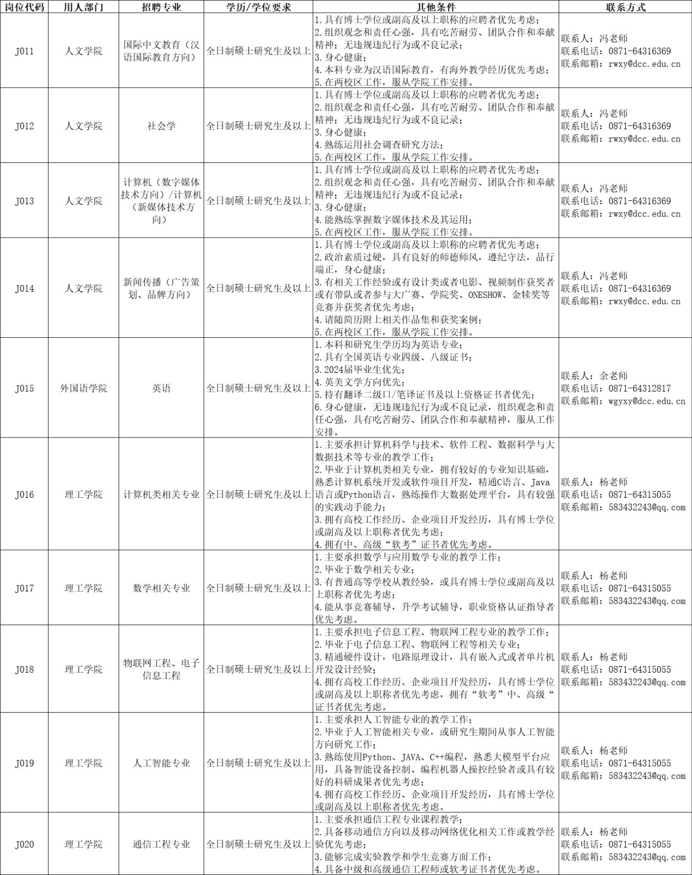 招聘崗位及相關要求詳見《滇池學院專職教師招聘計劃表》,具體招聘人數(shù)請咨詢相關用人教學單位。