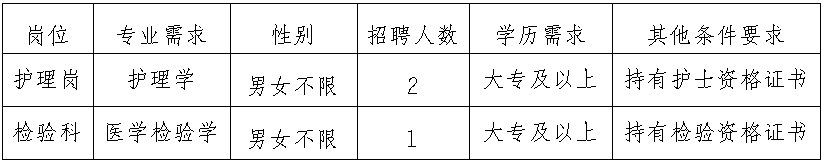 為滿足業(yè)務(wù)工作的需要,擬面向社會公開招聘2名編外護(hù)理人員、1名醫(yī)學(xué)檢驗(yàn)專業(yè)人員,現(xiàn)將有關(guān)招聘事宜公告如下: