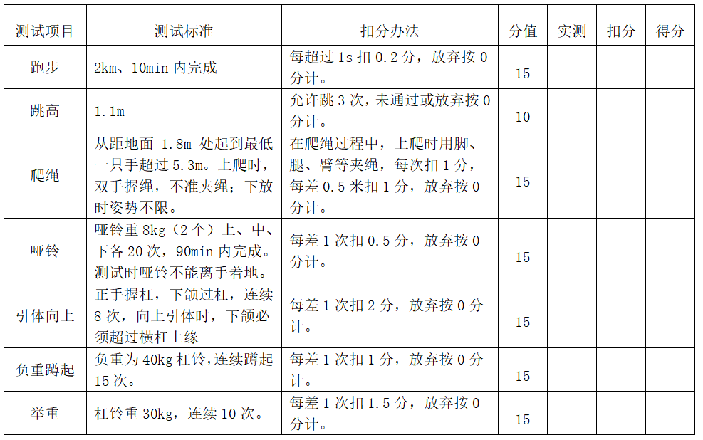 參照《礦山救護隊質量標準化考核規(guī)范》(AQ1009-2021)規(guī)定綜合體質標準要求測試7個項目:跑步、跳高、爬繩、啞鈴、引體向上、負重蹲起、舉重。總分100分,體能測試的7項總成績達80分以上為合格。